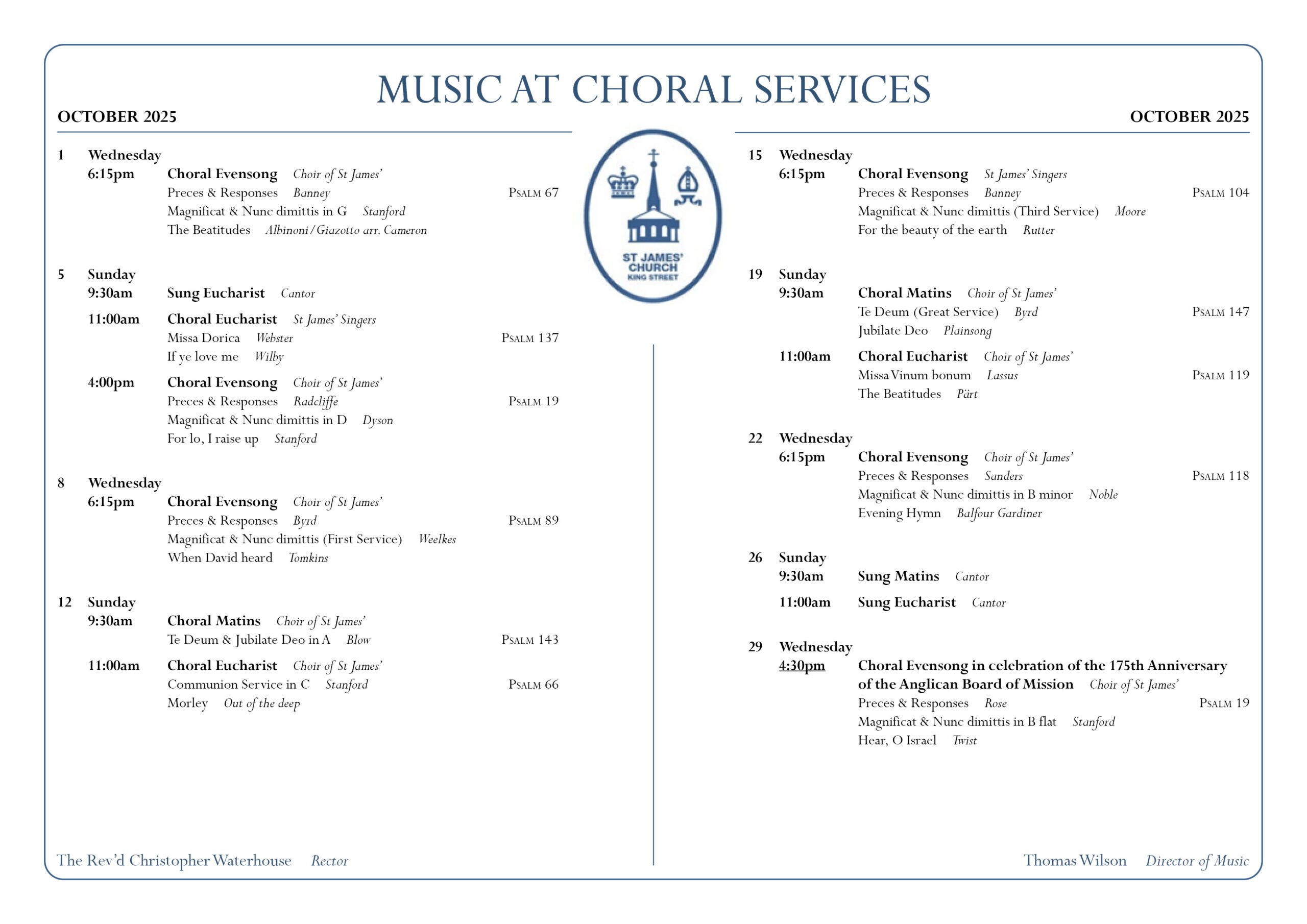 Our monthly lists contain a comprehensive list of the music at St James’ in the coming months.